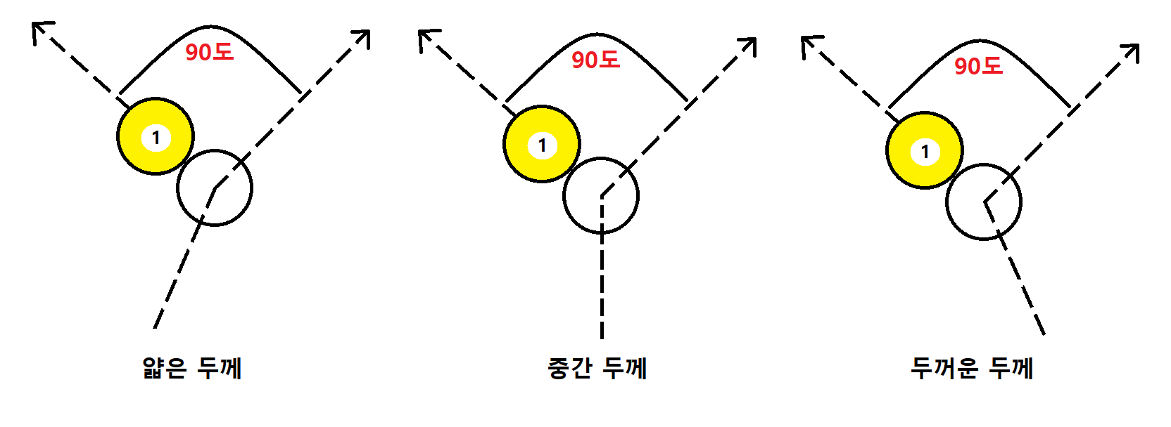 물리학에서 배우듯이, 무게와 탄성이 똑같은 두 개의 공이 충돌하면 두께와 상관없이 분리각은 언제나 90도를 유지한다는 것입니다. 쉽게말하면 어떤 두께를 쳐도 목적구의 진행방향과 수구(내가 친공)의 진행방향이 90도가 된다는 것입니다. 한번 그림으로 이해해봅시다.